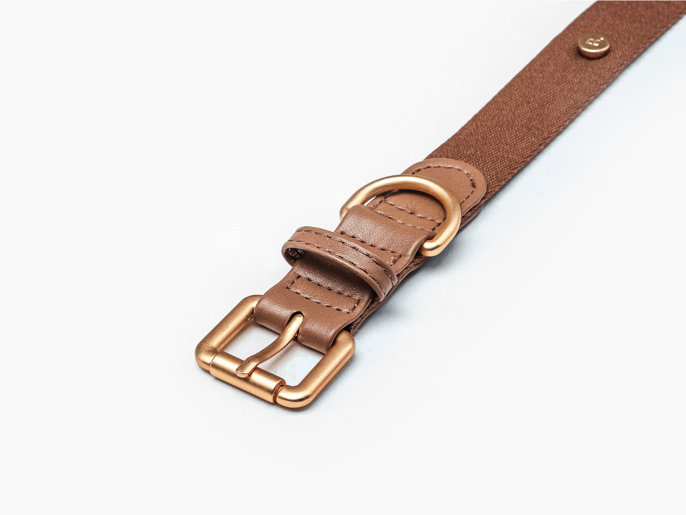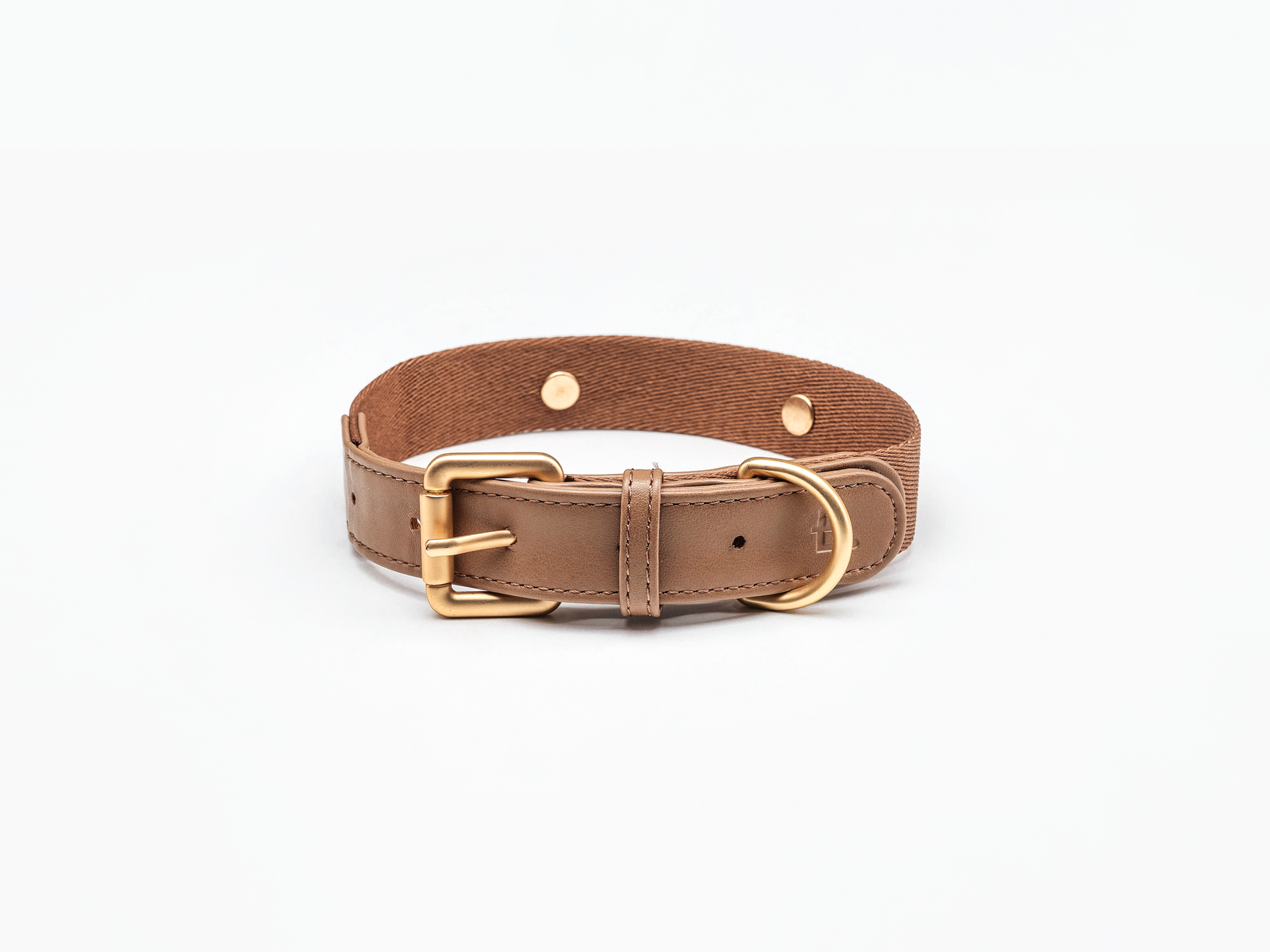 Looking for a stylish and sustainable dog collar? Our dog collar is made of recycled plastic bottles and vegan leather, so it's earth-friendly and stylish. The lightweight hardware is in a beautiful matte gold, and the collar comes in sizes XS-XL to fit any dog. The beige colour is perfect for fall and winter, and will make your dog stand out from the crowd. So go ahead and spoil your pup with a collar that's good for the environment and good-looking.