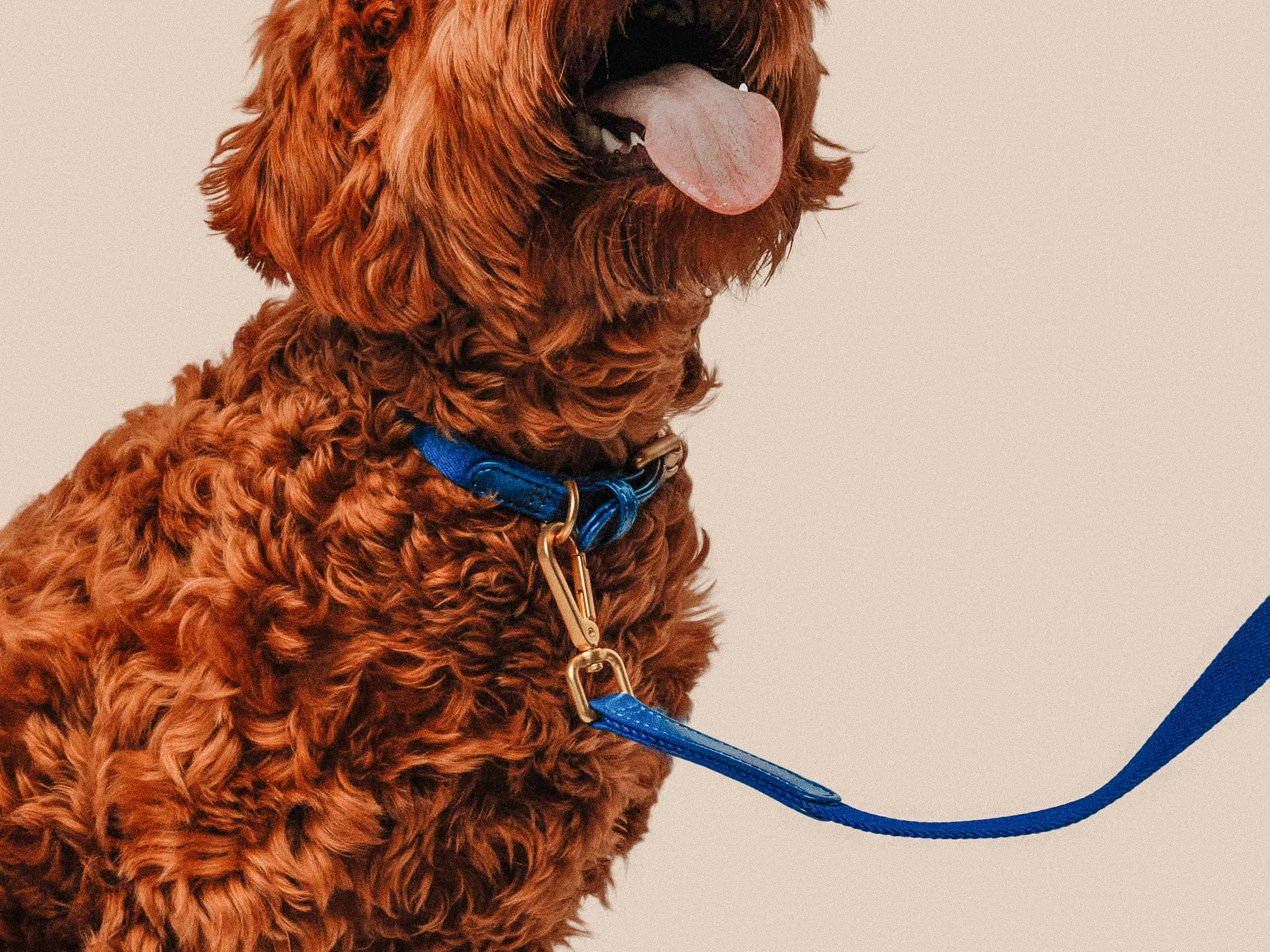 The blue dog leash is made of recycled plastic bottles and vegan leather, making it environmentally friendly and sustainable. It's also lightweight and comfortable for your dog to wear, with matte gold hardware that looks chic and elegant. Plus, the blue color is perfect for promoting calmness and tranquility. Get one today and give your furry friend the gift of a lifetime!